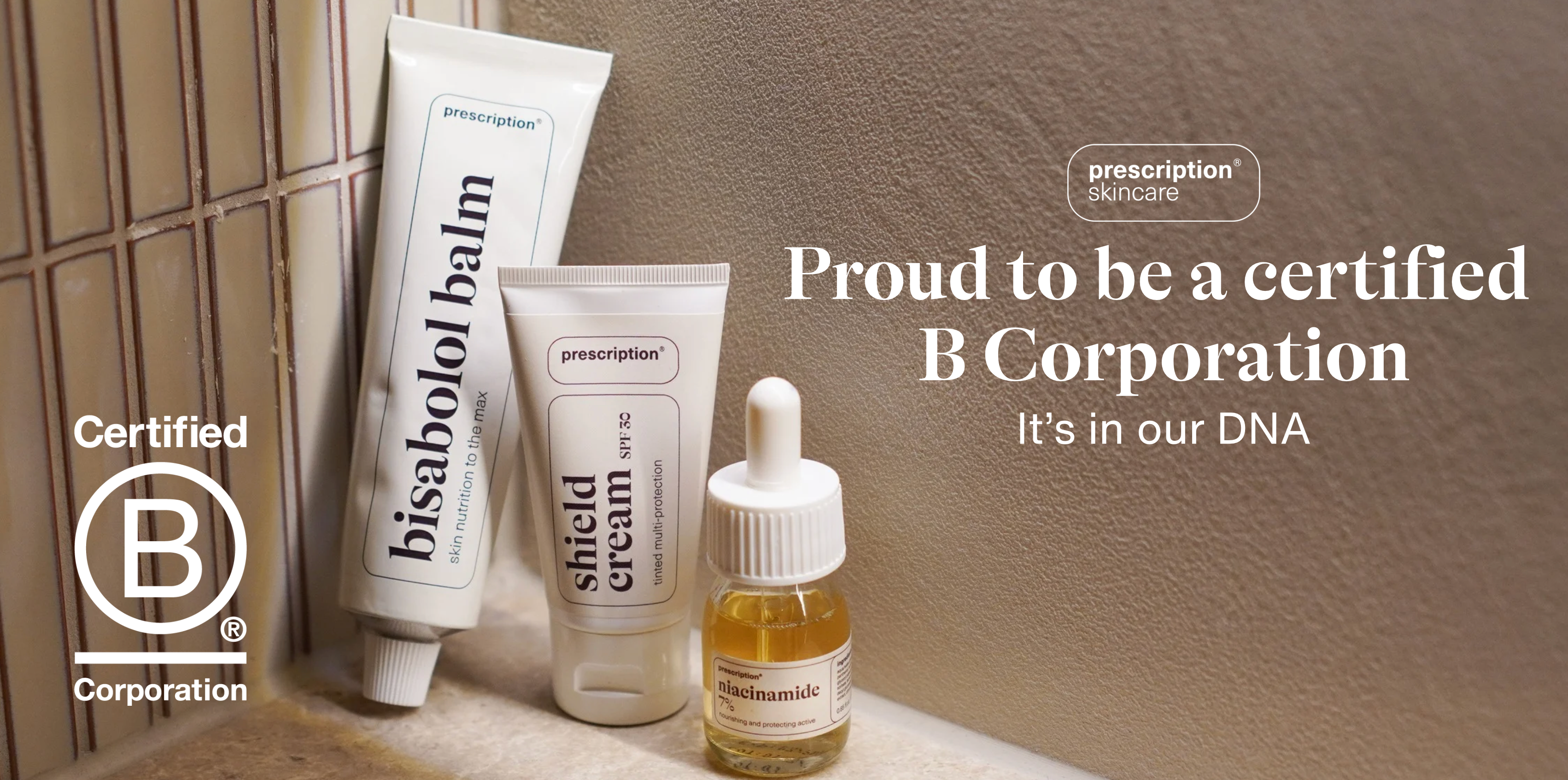 Bij Prescription Skincare geloven we dat echte huidverbetering begint bij kennis, ingrediënten en verantwoordelijkheid. Wat we op de huid aanbrengen, heeft impact, en die verantwoordelijkheid nemen we serieus. Daarom zijn wij met trots een Certified B Corporation®.